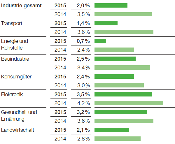Die globale Industrieproduktion wuchs im Jahr 2015 mit rund 2 % erheblich schwächer als im Vorjahr (+3,5 %) und blieb damit deutlich hinter dem von uns erwarteten Wert von 3,6 % zurück. Ihr Wachstum verringerte sich sowohl in den fortgeschrittenen Volkswirtschaften (2015: +0,9 %, 2014: +2,4 %) als auch in den Schwellenländern (2015: +3,1 %, 2014: +4,6 %) erheblich.