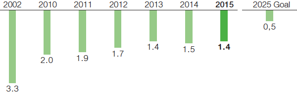 The number of Process Safety Incidents has served as an important key performance indicator since 2008, and is largely based on the definition set by the European Chemical Industry Council (CEFIC). This KPI mainly tracks the release of substances, in addition to fire and explosions. In 2015, we recorded 2.1 process safety incidents per one million working hours (2014: 2.21). In order to constantly improve, we set ourselves the goal in 2015 of achieving a rate of 0.5 or below by 2025. To this end, we began a worldwide initiative focusing on plant maintenance, repair and operation. We perform a detailed investigation into every incident, analyzing root causes and using the findings to derive suitable measures to take.