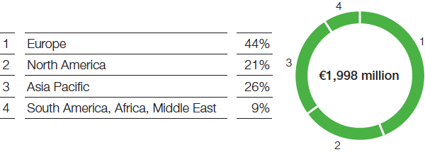 In the Nutrition & Health division, sales to third parties decreased by €31 million to €1,998 million despite positive currency effects (volumes 1%, prices –7%, portfolio –3%, currencies 7%). Intense competitive pressure, especially in the vitamin E business, along with decreased raw material costs in the aroma chemicals business, led to a decline in prices. Sales were furthermore reduced by the disposal of parts of our pharmaceutical ingredients and services business, which involved the custom synthesis business and parts of the active pharmaceutical ingredients portfolio.