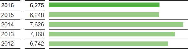 At €6,275 million, EBIT for the BASF Group in 2016 matched the level of the previous year (2015: €6,248 million). Included in this figure is income from companies accounted for using the equity method, which rose from €251 million to €307 million.