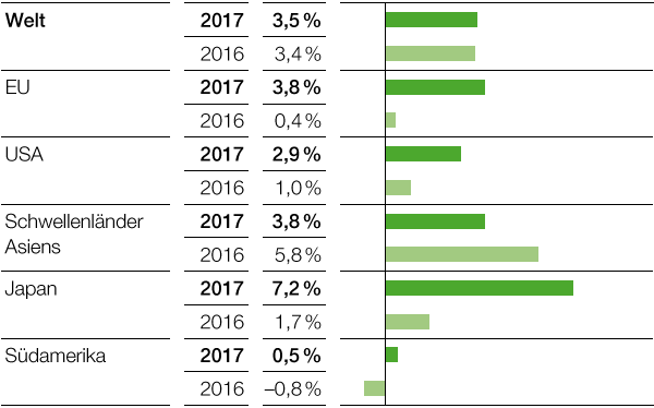 Entwicklung der chemischen Industrie Globales Wachstum entsprechend den Erwartungen Die globale chemische Industrie (ohne Pharma) wuchs um 3,5 % und entsprach damit etwa unseren Erwartungen von Anfang 2017 (+3,4 %) sowie dem Niveau von 2016 (+3,4 %). Die Chemieproduktion in der EU nahm infolge der steigenden Nachfrage aus einheimischen Kundenindustrien und höherer Exporte deutlich stärker zu (2017: +3,8 %, 2016: +0,4 %). Das Wachstum der chemischen Industrie in Asien ging hingegen zurück (2017: +4,1 %, 2016: +5,2 %). Eine außergewöhnlich starke Konjunktur in Japan, vor allem infolge zunehmender Exporte nach China, konnte den Wachstumsrückgang in China nicht vollständig kompensieren. In Nordamerika wurde die Chemieproduktion durch den Hurrikan Harvey beeinträchtigt, der im dritten Quartal zu erheblichen Produktionsausfällen in den USA geführt hatte. Dennoch legte die Chemieproduktion in den USA um 2,9 % zu. Chemieproduktion (ohne Pharma) (Reale Veränderung gegenüber Vorjahr 1) 1 Angaben, die sich auf zurückliegende Jahre beziehen, können aufgrund von statistischen Revisionen vom Vorjahresbericht abweichen. zurück weiter