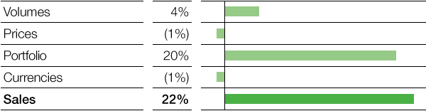 Coatings Sales growth of 22% to €3,969 million from Chemetall acquisition and higher volumes EBIT before special items considerably below prior-year figure due to higher fixed costs and lower margins In the Coatings division, sales to third parties in 2017 grew by €720 million to €3,969 million, mainly as a result of the Chemetall business acquired in December 2016. We increased sales volumes in Asia and Europe in particular. Sales were reduced by negative currency effects, especially in Asia and North America, as well as slightly lower prices. Sales of automotive OEM coatings increased thanks to higher volumes in all regions. We recorded slight sales growth in the automotive refinish coatings business, as we were able to more than offset the negative currency effects with higher sales volumes and the acquisition of Guangdong Yinfan Chemistry, Jiangmen, China, in September 2016. In the decorative paints business in Brazil, sales were up slightly on the prior-year figure: currency effects and slight price increases had a positive impact, while demand declined slightly. Coatings – Factors influencing sales Coatings – Sales by region (Location of customer) EBIT before special items in the Coatings division declined considerably. The Chemetall business made a positive contribution to earnings but was unable to compensate for the decline in the businesses not affected by the portfolio measures. The decrease in the latter was mainly due to higher fixed costs and lower margins as a result of the increase in raw materials prices. Special charges arose from the integration of the Chemetall business and the restructuring in connection with the divestiture of the industrial coatings business, which was completed in December 2016 and led to special income in the prior year. In November 2017, we inaugurated a new large-scale automotive coatings plant at the Caojing site in Shanghai, China, to complement our existing automotive coatings plant there. We also inaugurated a production facility for automotive OEM coatings in Bangpoo, Thailand. With the expansion, we aim to even better serve the growing automobile market in Asia Pacific, especially in China. back next