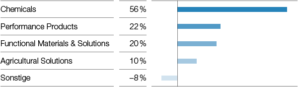 Geschäftsentwicklung in den Segmenten Überblick (XLS:) Download Segmente im Überblick (Millionen €) Umsatz Ergebnis der Betriebstätigkeit vor Abschreibungen (EBITDA) Ergebnis der Betriebstätigkeit (EBIT) vor Sondereinflüssen 2018 2017 2018 2017 2018 2017 1 Investitionen in Sachanlagen (davon aus Akquisitionen 1.425 Millionen € im Jahr 2018 und 8 Millionen € im Jahr 2017) und immaterielle Vermögenswerte (davon aus Akquisitionen 5.540 Millionen € im Jahr 2018 und 235 Millionen € im Jahr 2017) Chemicals 16.501 16.331 4.432 5.374 3.386 4.233 Performance Products 15.812 16.217 2.205 2.427 1.376 1.416 Functional Materials & Solutions 21.435 20.745 1.917 2.251 1.307 1.617 Agricultural Solutions 6.156 5.696 985 1.282 734 1.033 Sonstige 2.771 2.234 –373 –569 –450 –654 BASF-Gruppe 62.675 61.223 9.166 10.765 6.353 7.645 Ergebnis der Betriebstätigkeit (EBIT) Vermögen Investitionen inklusiveAkquisitionen 1 2018 2017 2018 2017 2018 2017 Chemicals 3.360 4.208 13.264 13.233 1.325 1.149 Performance Products 1.338 1.510 14.903 14.432 765 800 Functional Materials & Solutions 1.235 1.545 17.654 17.364 872 1.056 Agricultural Solutions 591 1.015 16.992 8.096 7.110 185 Sonstige –491 –691 23.743 25.643 663 1.174 BASF-Gruppe 6.033 7.587 86.556 78.768 10.735 4.364 Anteil der SegmenteAnteil der Segmente am Umsatz Anteil der Segmente am EBITDA Anteil der Segmente am EBIT vor Sondereinflüssen Anteil der Segmente am EBIT Entwicklung nach Quartalen (XLS:) Download Umsatz 1 (Millionen €) 1. Quartal 2. Quartal 3. Quartal 4. Quartal 2018 2017 2018 2017 2018 2017 2018 2017 1 Quartalswerte stellen ungeprüfte Informationen dar. Chemicals 4.286 4.105 4.132 4.045 4.309 4.023 3.774 4.158 Performance Products 3.991 4.260 3.949 4.142 3.989 3.983 3.883 3.832 Functional Materials & Solutions 5.139 5.198 5.540 5.261 5.238 4.975 5.518 5.311 Agricultural Solutions 1.728 1.855 1.501 1.526 1.243 987 1.684 1.328 Sonstige 556 609 661 475 827 548 727 602 BASF-Gruppe 15.700 16.027 15.783 15.449 15.606 14.516 15.586 15.231 (XLS:) Download Ergebnis der Betriebstätigkeit (EBIT) vor Sondereinflüssen 1 (Millionen €) 1. Quartal 2. Quartal 3. Quartal 4. Quartal 2018 2017 2018 2017 2018 2017 2018 2017 1 Quartalswerte stellen ungeprüfte Informationen dar. Chemicals 1.134 958 1.074 1.120 851 1.102 327 1.053 Performance Products 470 515 409 405 360 385 137 111 Functional Materials & Solutions 333 531 338 422 347 397 289 267 Agricultural Solutions 423 533 278 272 –5 21 38 207 Sonstige –79 –239 –127 –99 –83 –203 –161 –113 BASF-Gruppe 2.281 2.298 1.972 2.120 1.470 1.702 630 1.525 (XLS:) Download Ergebnis der Betriebstätigkeit (EBIT) 1 (Millionen €) 1. Quartal 2. Quartal 3. Quartal 4. Quartal 2018 2017 2018 2017 2018 2017 2018 2017 1 Quartalswerte stellen ungeprüfte Informationen dar. Chemicals 1.126 974 1.064 1.119 846 1.089 324 1.026 Performance Products 482 499 402 363 348 567 106 81 Functional Materials & Solutions 325 521 326 427 337 357 247 240 Agricultural Solutions 417 531 259 270 –39 20 –46 194 Sonstige –87 –233 –145 –129 –97 –209 –162 –120 BASF-Gruppe 2.263 2.292 1.906 2.050 1.395 1.824 469 1.421 Mehr in diesem Kapitel: ChemicalsPerformance ProductsFunctional Materials & SolutionsAgricultural Solutions zurück weiter