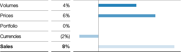 Petrochemicals Sales rise 8% to €6,904 million due to higher prices and volumes Considerable decline in EBIT before special items attributable to lower margins, higher fixed costs and low water level of Rhine River The Petrochemicals division increased sales to third parties by €515 million to €6,904 million in 2018. This was mainly due to significantly higher sales prices. These rose in all regions and business areas, largely following the higher raw materials prices for naphtha and butane, our most important feedstock. We also increased volumes. In Europe, sales volumes were slightly higher than in the previous year, as the supply of raw materials through the North Harbor and thus production in Ludwigshafen, Germany, was severely restricted in 2017. However, the low water levels on the Rhine River in the third and fourth quarters of 2018 led to significant production limitations. Volumes rose in North America, mainly as a result of higher capacity utilization of the condensate splitter in Port Arthur, Texas. Sales were dampened by currency effects. Petrochemicals – Factors influencing sales Petrochemicals – Sales by region Location of customer EBIT before special items declined considerably. Compared with the very strong prior-year level, margins decreased significantly over the course of the year, especially for steam cracker products. This was due to higher market supply as a result of new capacities in the market, particularly in North America. Fixed costs increased. In the previous year, we received significantly higher insurance refunds; in addition, maintenance expenses were up from the 2017 figure. The low water levels on the Rhine River was a significant contributor to the decline in earnings. back next
